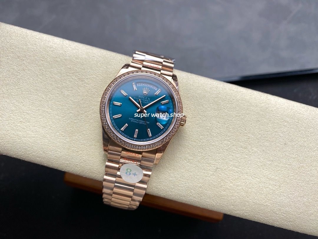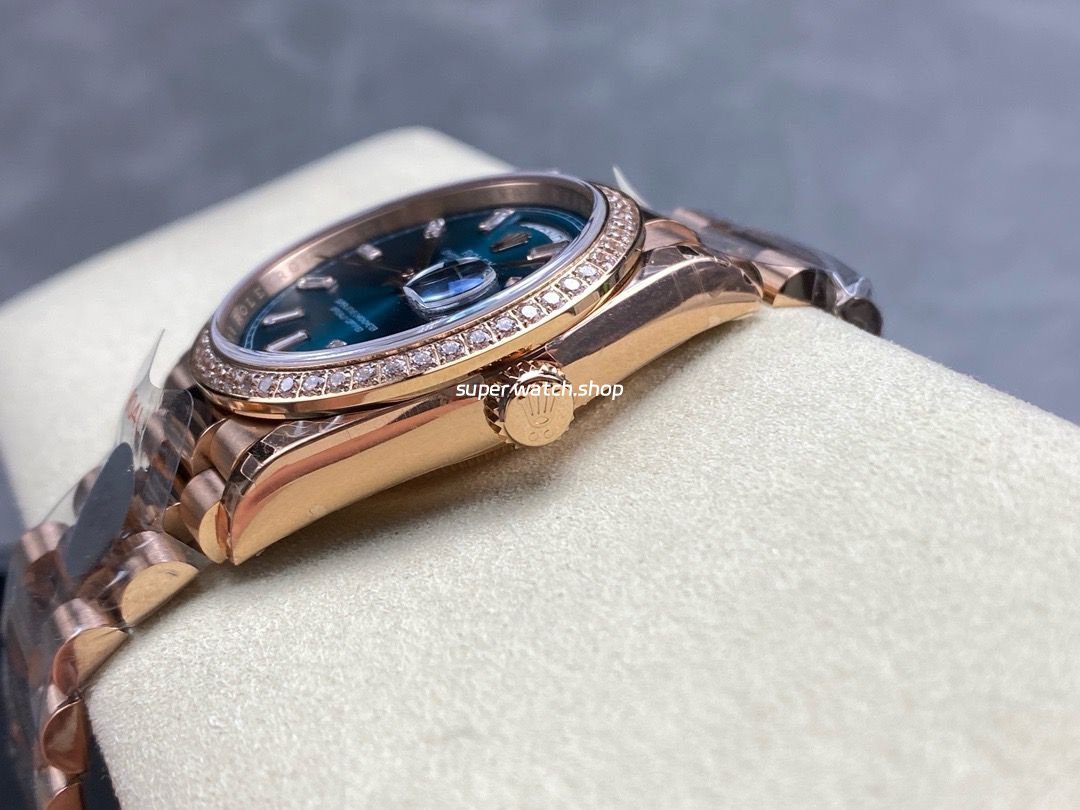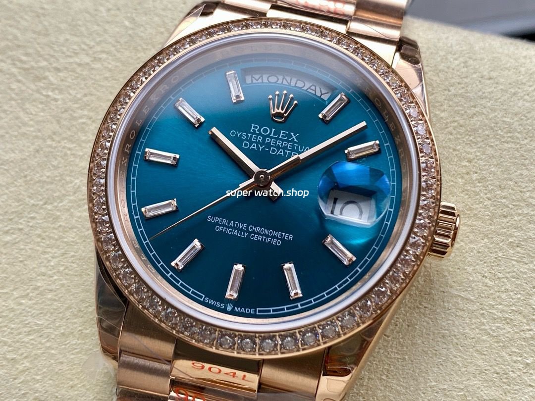 8+ Factory Counterweight Rolex Day-Date 128345RBR-0083 36mm Diamond Bezel Full Rose Gold Baguette Diamond Blue Green Dial