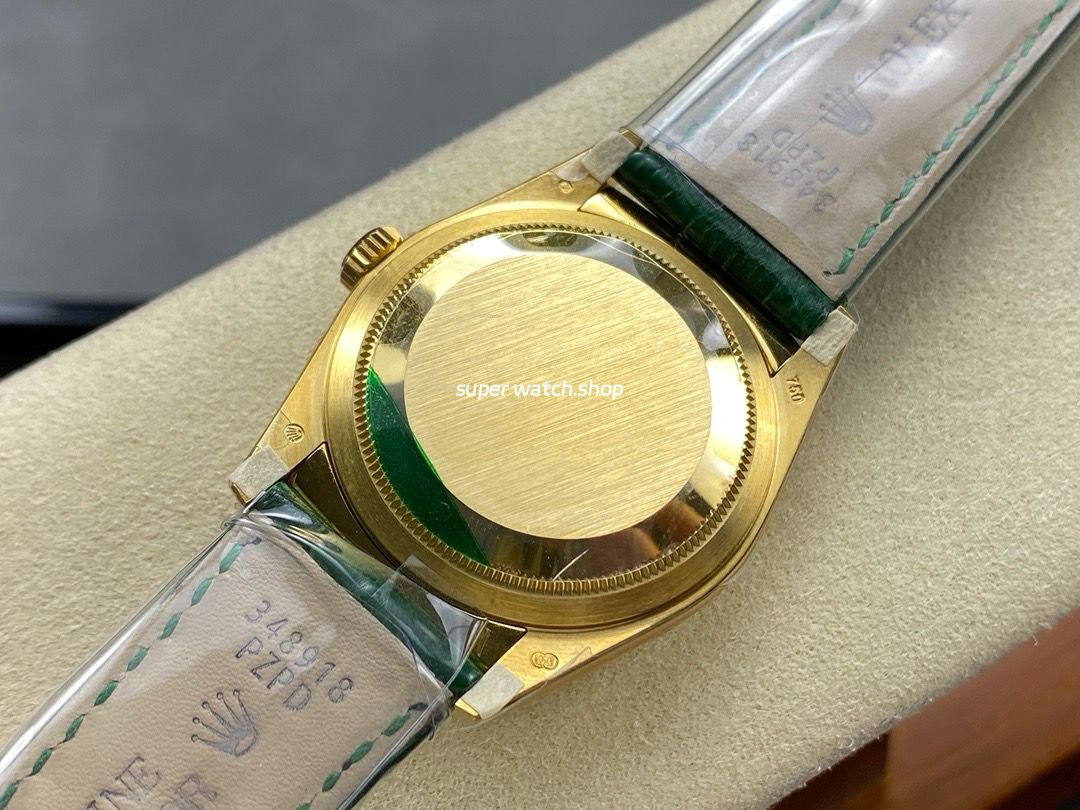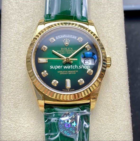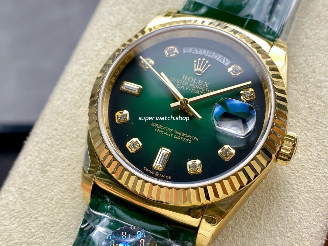 8+ Factory Counterweight Rolex Day-Date 36mm 128238-0069 Yellow Gold Crocodile Leather Strap Diamond Mope&Baguette Diamond Green Ombré Dial