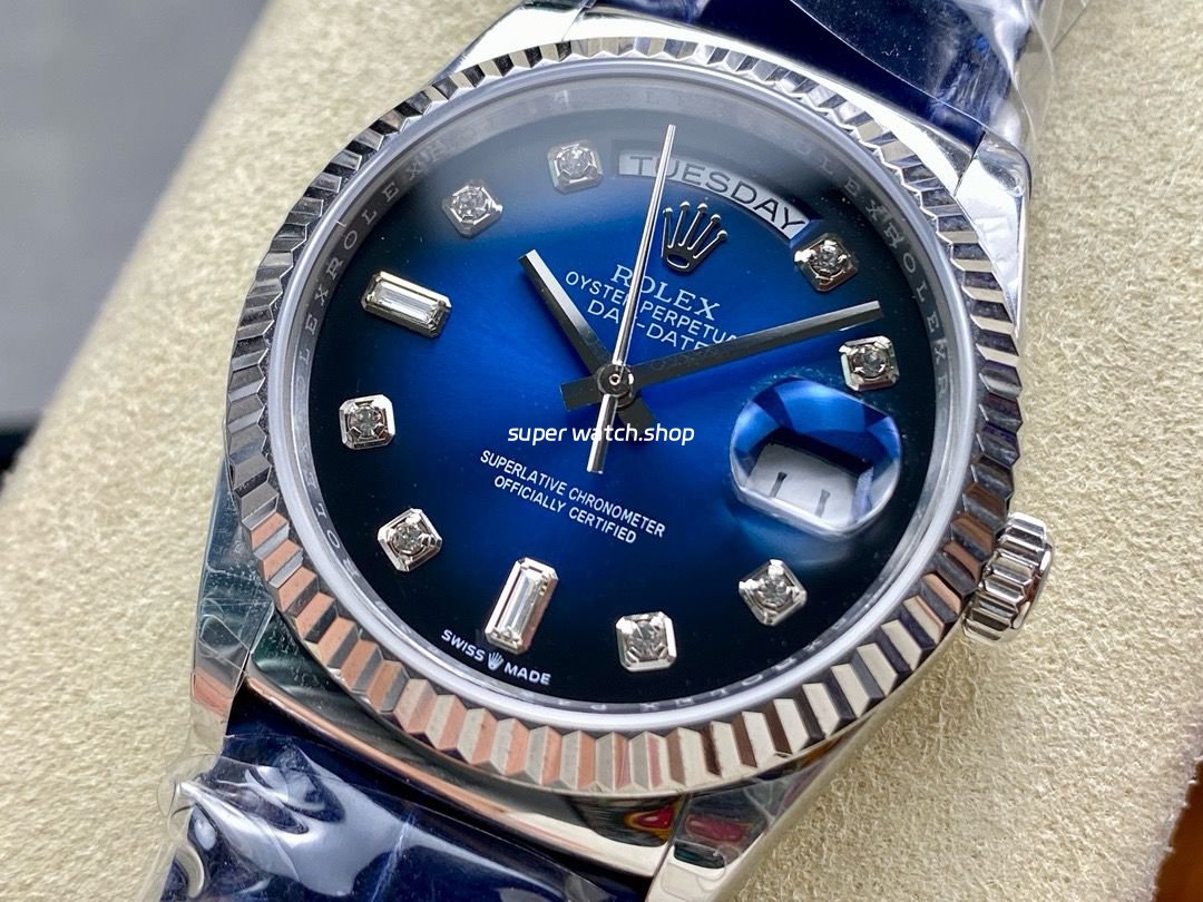 8+ Factory Counterweight Rolex Day-Date 36mm 128239-0023 White Gold Crocodile Leather Strap Diamond Mope&Baguette Diamond Blue Ombré Dial