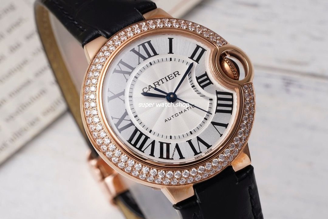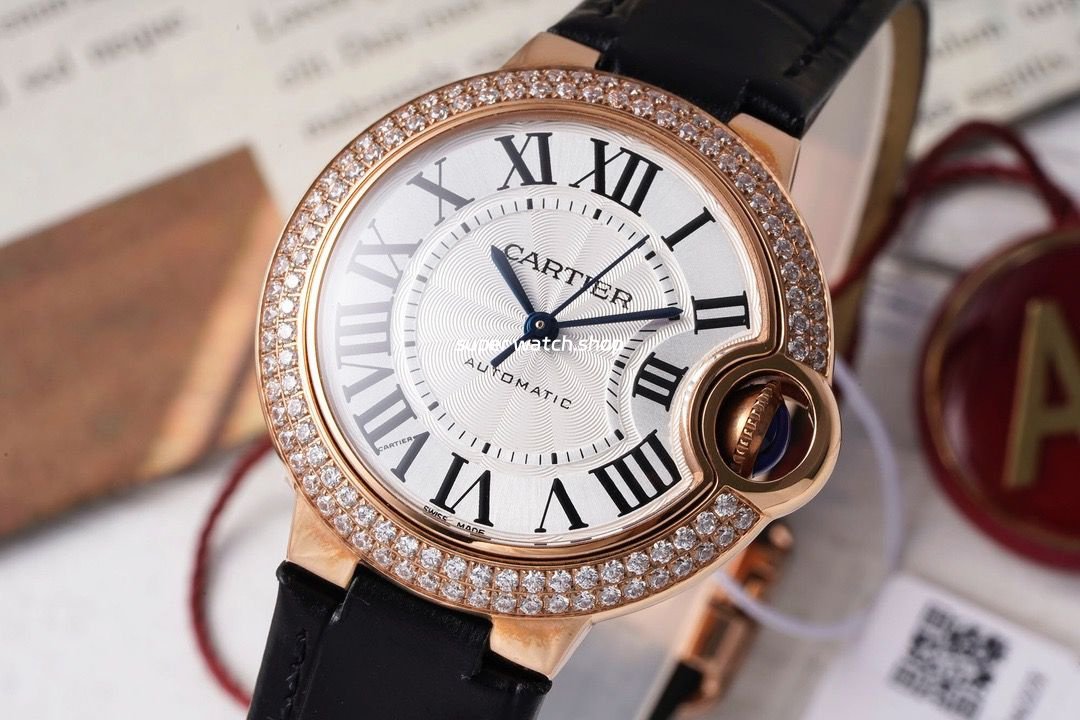 AF Factory Cartier Ballon Bleu WJBB0033 33mm Diamond Bezel Rose Gold Leather Strap Roman Numerals Silver Dial