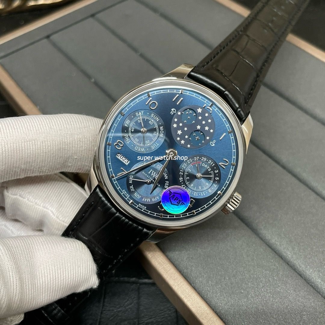 APS Factory IWC Portuguese Perpetual Calendar IW503401 44mm White Gold Leather Strap Arabic Numerals Blue Dial