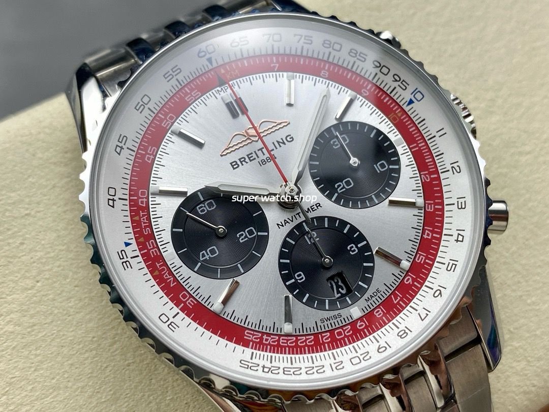 Slide Rule: The outer ring features the iconic circular slide rule, a hallmark of the Navitimer series, designed to assist pilots with in-flight calculations.