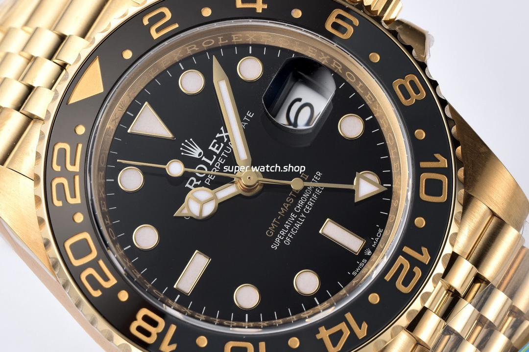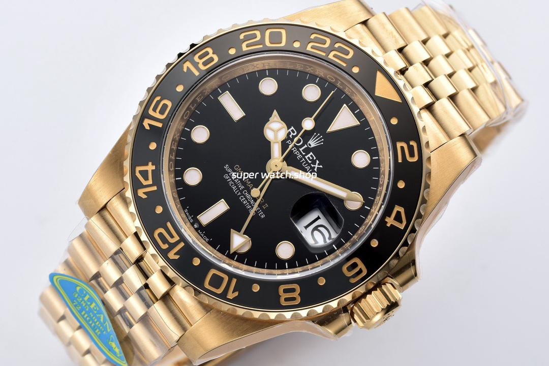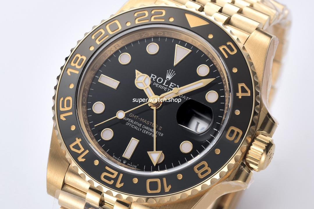 Clean Factory Rolex GMT-Master II 126718GRNR-0001 40mm Full Yellow Gold Black Dial Jubilee
