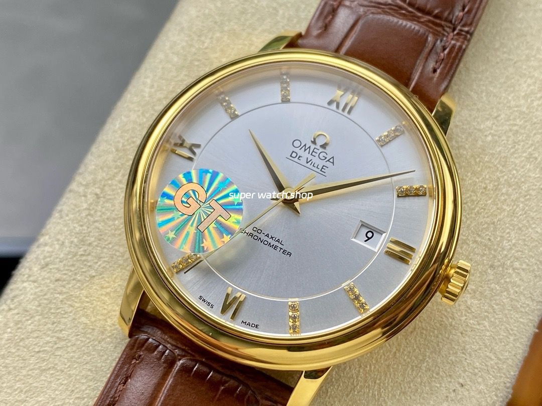 GT Factory Omega De Ville Prestige 424.53.40.20.52.001 39.5mm Gold Leather Strap Gold Roman Number Silver Dial