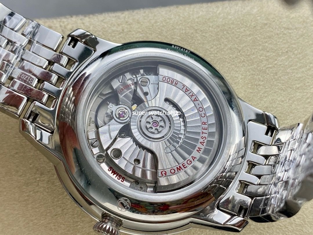 Transparent Case Back Design | Omega 8800 Master Chronometer Movement Inside Equipped with the Omega 8800 Master Chronometer movement, the transparent sapphire case back allows a clear view of the movement in action, showcasing the beauty of the mechanics.