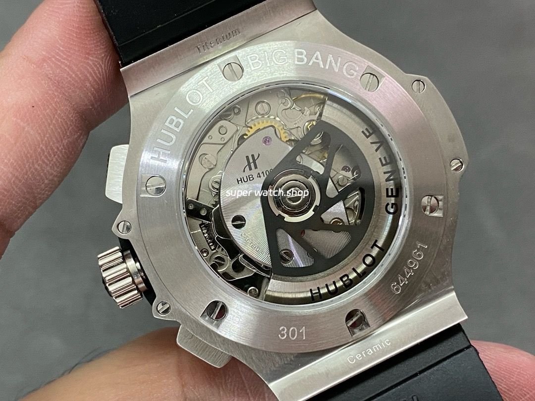 Exhibition Case Back: Transparent sapphire case back reveals Geneva-striped decorated bridges and a laser-engraved “HUB4100” logo.