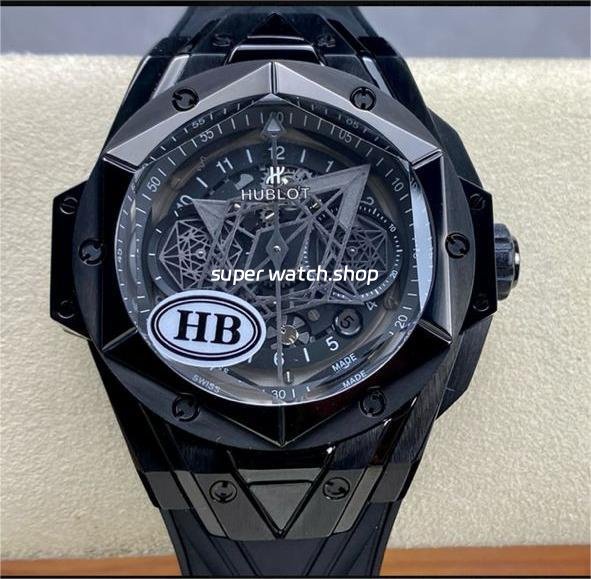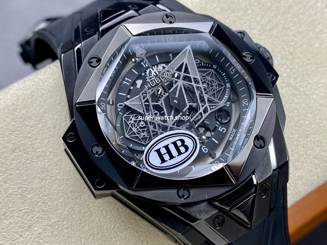 HB Factory Hublot Big Bang Sang Bleu 418.CX.1114.RX.MXM20 45mm Ceramic Black Rubber Strap Grey Needle Skeletonized Black Dial