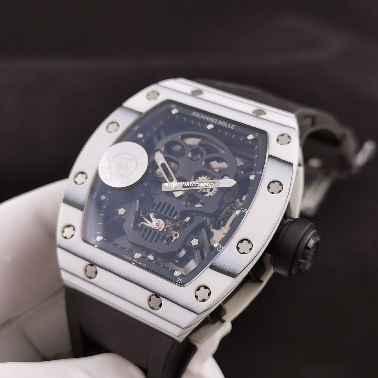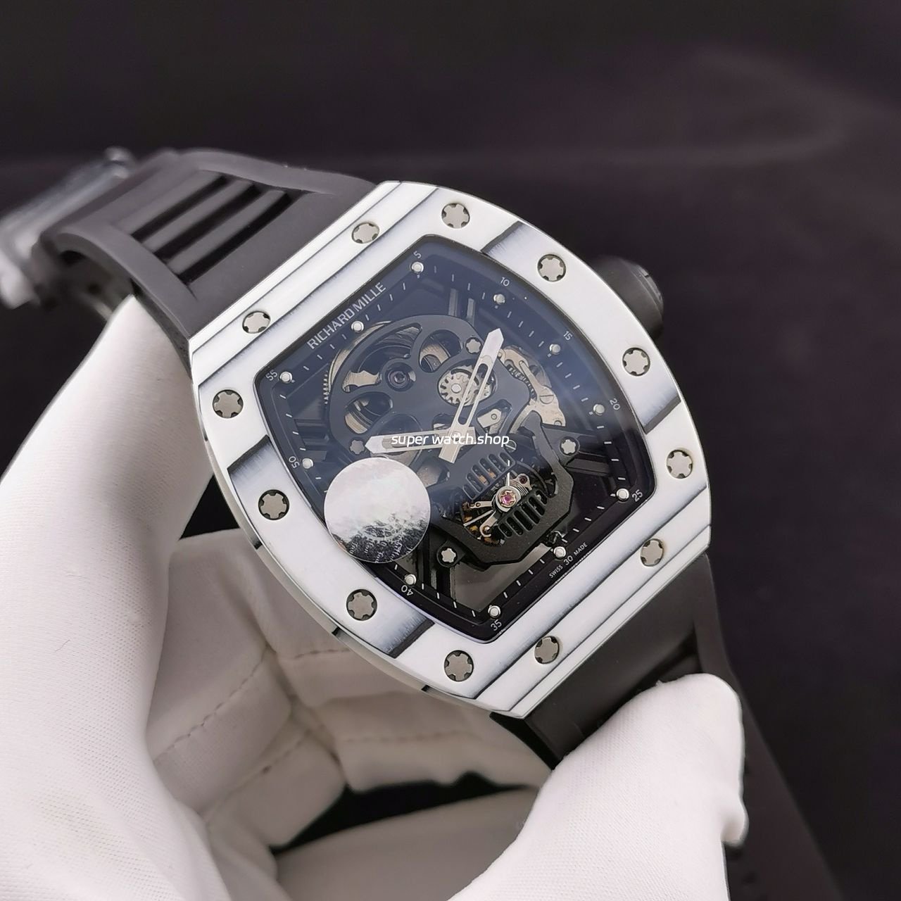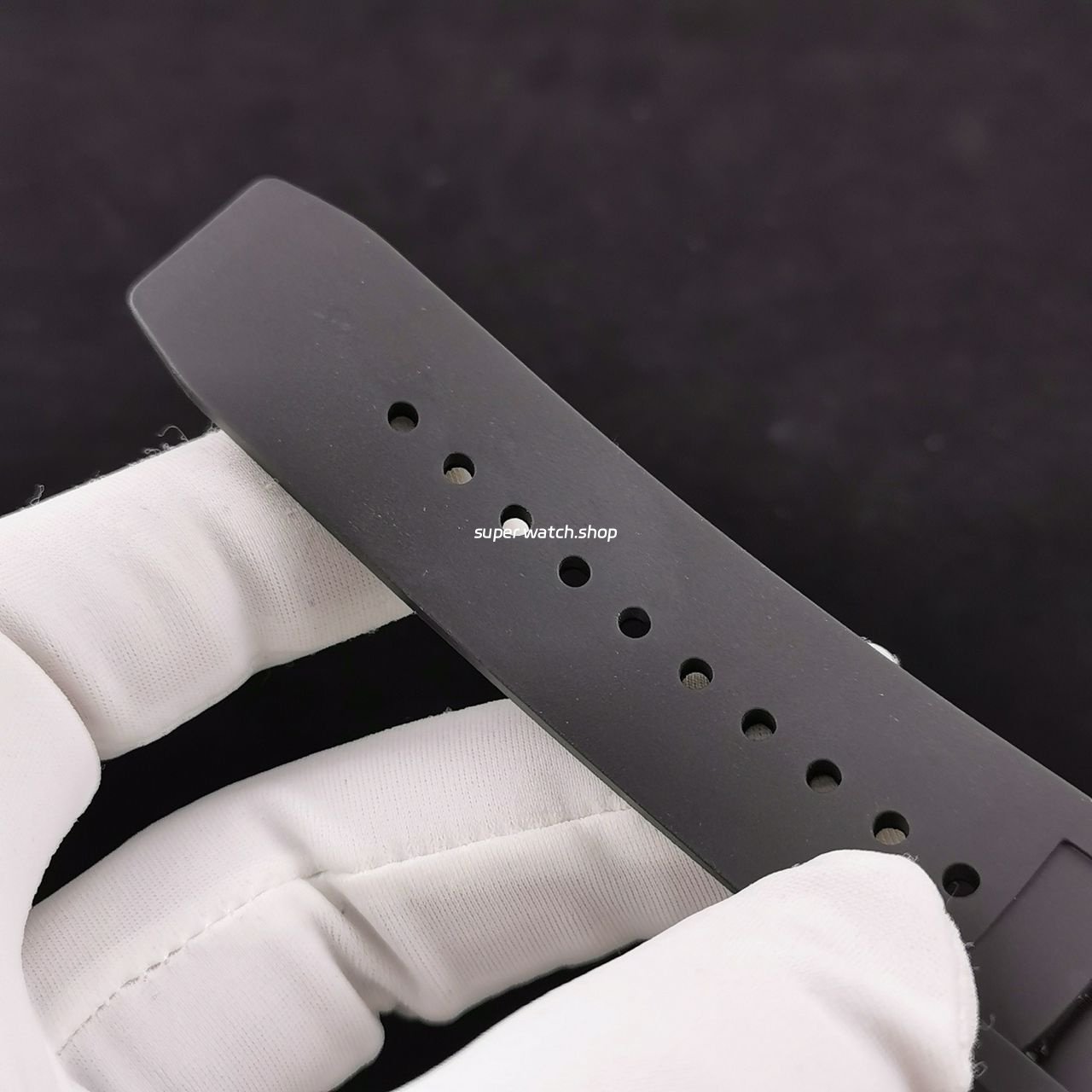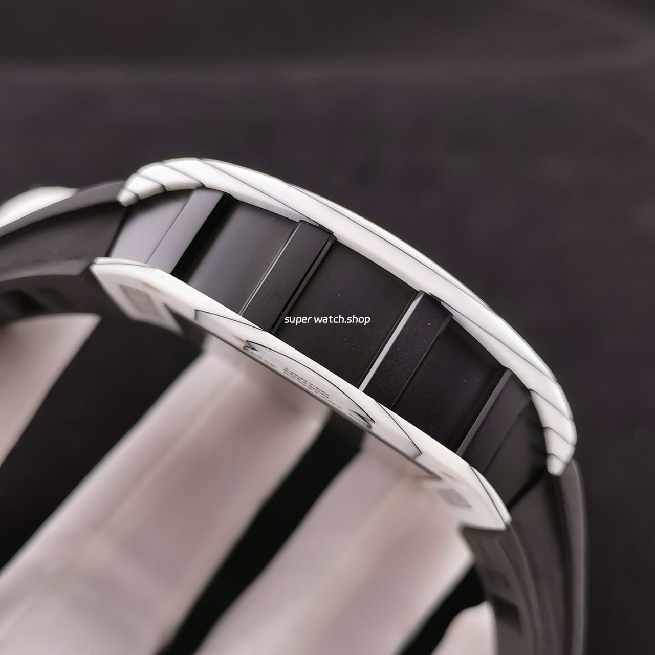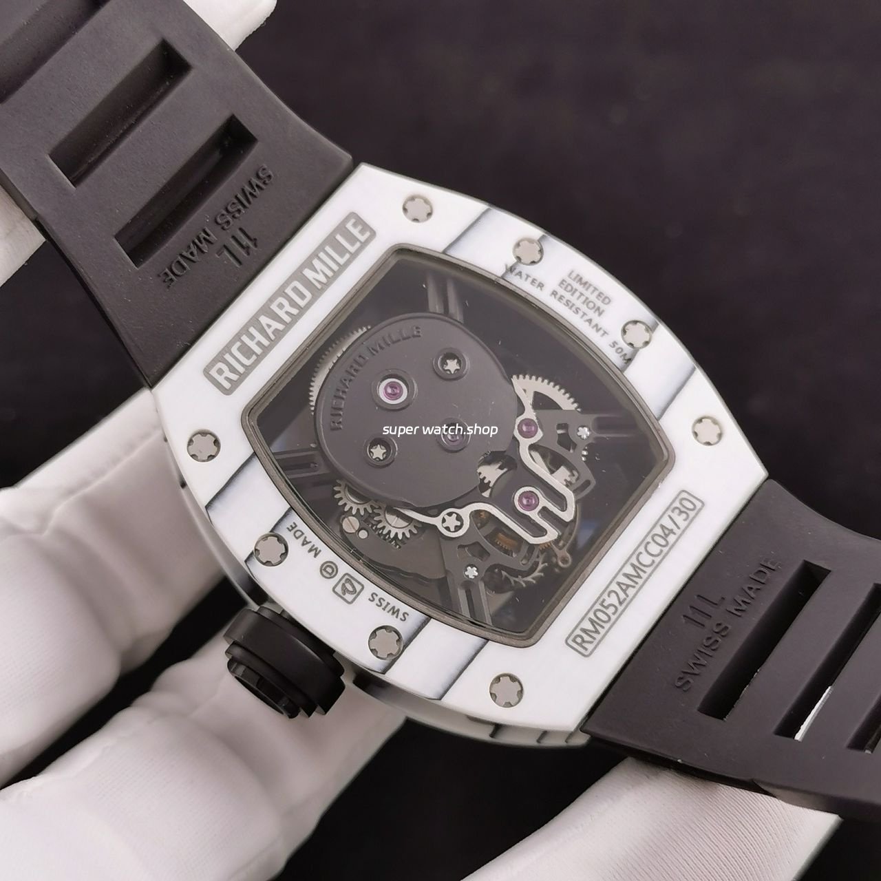 3. The details are in place: the left inner wall of the inner cover of the watch case is stamped with RM052 steel stamp like the original one, the size and depth of the right eye gear are close to the original one, the gem in the center of the forehead is ruddy and clear, the frosted buckle, and the rubber strap imported from Thailand;