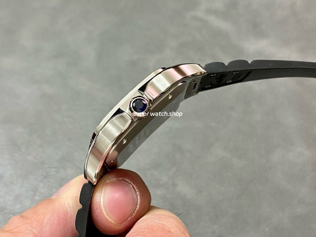 Every detail of the THB Santos Rubber Strap Edition reflects meticulous attention to craftsmanship. The crown is adorned with a multi-faceted synthetic sapphire, delivering a dazzling brilliance and enhancing the watch luxurious appeal a signature element that mirrors the iconic Cartier design.