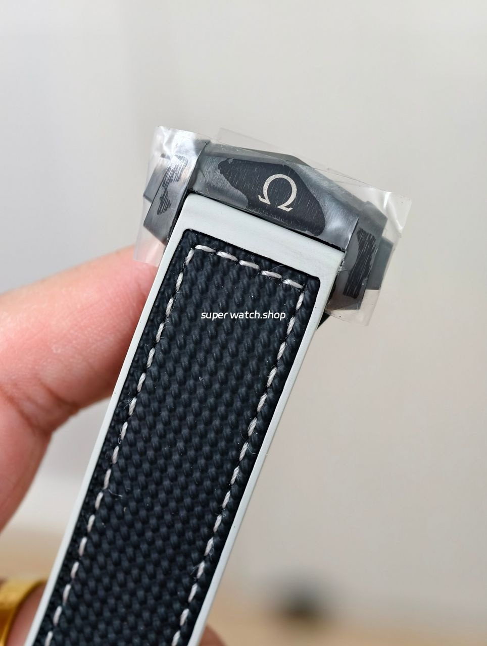 • Black ceramic tang buckle engraved with the Omega logo; durable and visually cohesive.